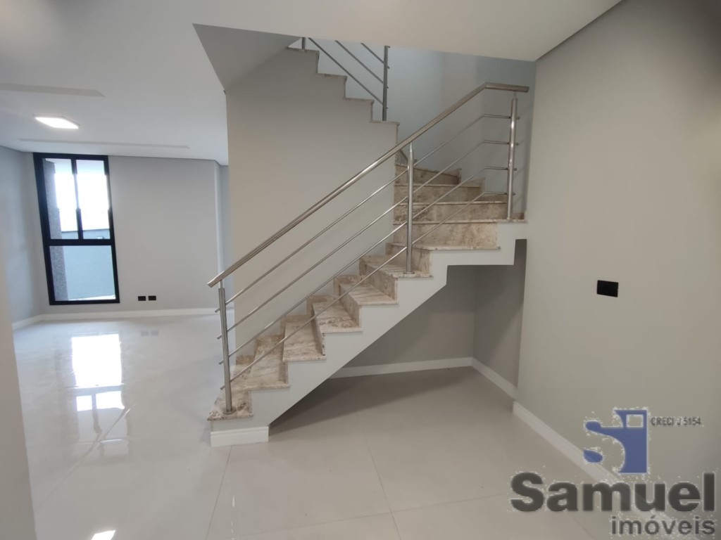 A escada foi revestida em granito travertino e corrimão em Inox polido.